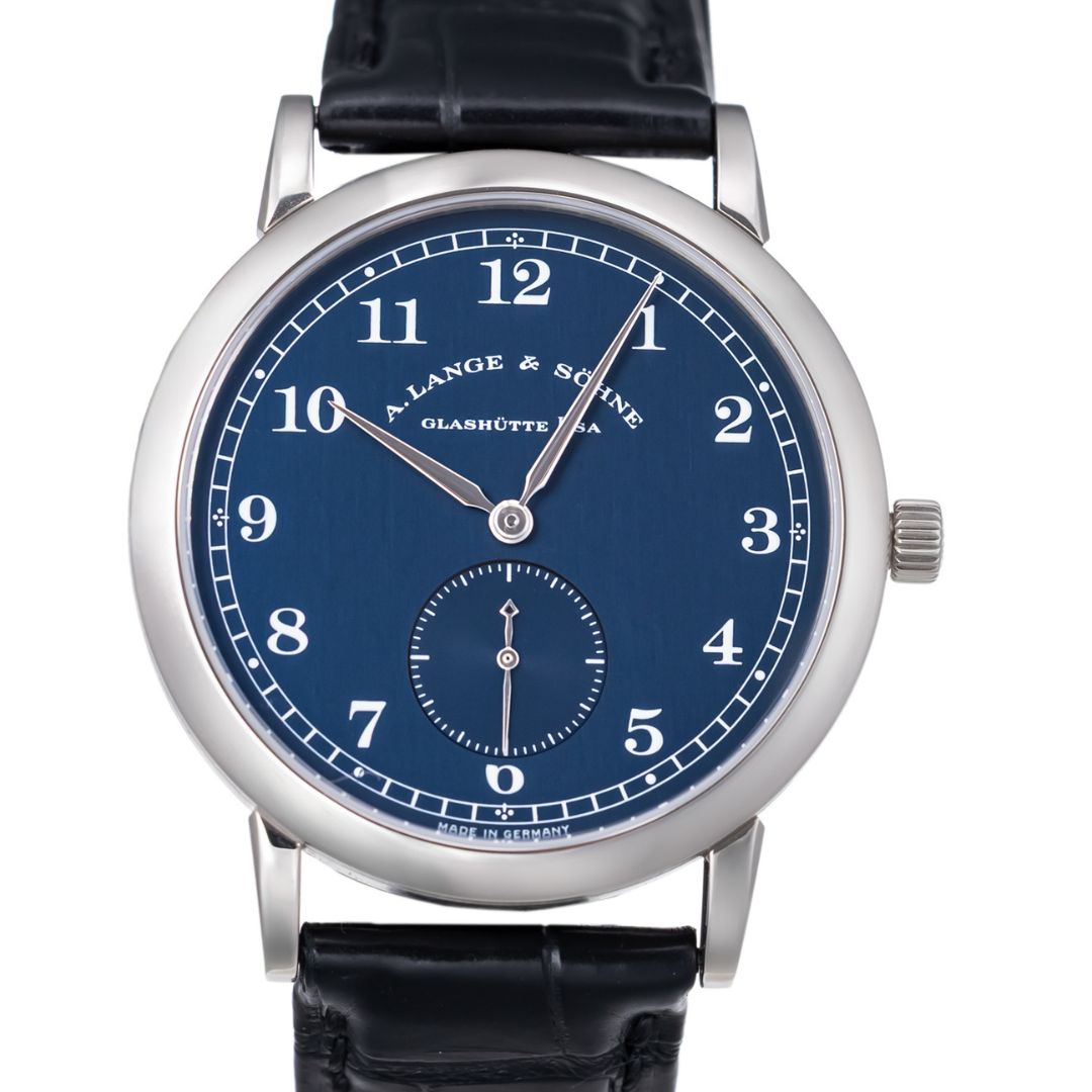The 36mm white gold case is beautifully proportioned and finished to Lange’s exacting standards, with a mix of polished and brushed surfaces that exude refinement. The rich matte blue dial features classic Arabic numerals and a small seconds subdial at 6 o’clock, all framed by the signature railway minute track.